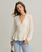 La pièce maîtresse, c'est sa silhouette. Les manches lanternes spectaculaires et les détails plissés créent un volume incroyable qui affine la taille lorsqu'elle est rentrée dans un jean taille haute. C'est la solution idéale pour un look décontracté chic, comme un jean et un joli haut, pour un rendez-vous galant ou un brunch. Mais, étonnamment, c'est aussi un vêtement parfait pour le bureau. La dentelle délicate qui orne le décolleté en V et les boutons fins mettent parfaitement en valeur votre visage, ce qui en fait le haut idéal pour les appels vidéo. Le tissu non extensible permet aux manches structurées de conserver leur forme, du trajet du matin jusqu'à l'apéritif. Un charme d'inspiration vintage allié à une allure moderne. - Occasion : Quotidien - Style : Élégant - Saison : Printemps, Automne, Hiver - Élasticité du tissu : Non extensible - Longueur des manches : Manches longues - Type de manches : Manches lanternes - Motif : Uni - Ornements : Plis, Boutons, Dentelle - Encolure : Col en V - Composition : Polyester