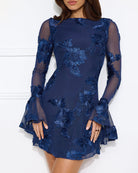 Robe mini dos nu à manches cloche et manches jacquard bleu