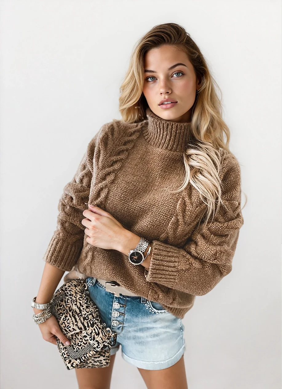 L'élégance chaleureuse rencontre le raffinement : un pull qui allie avec brio douceur, style et classe. Avec sa magnifique maille torsadée et son col montant, le pull Serafina Delacroix vous enveloppe d'un luxe absolu. Idéal pour les journées fraîches où vous souhaitez afficher une élégance sans sacrifier votre confort.
