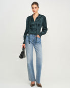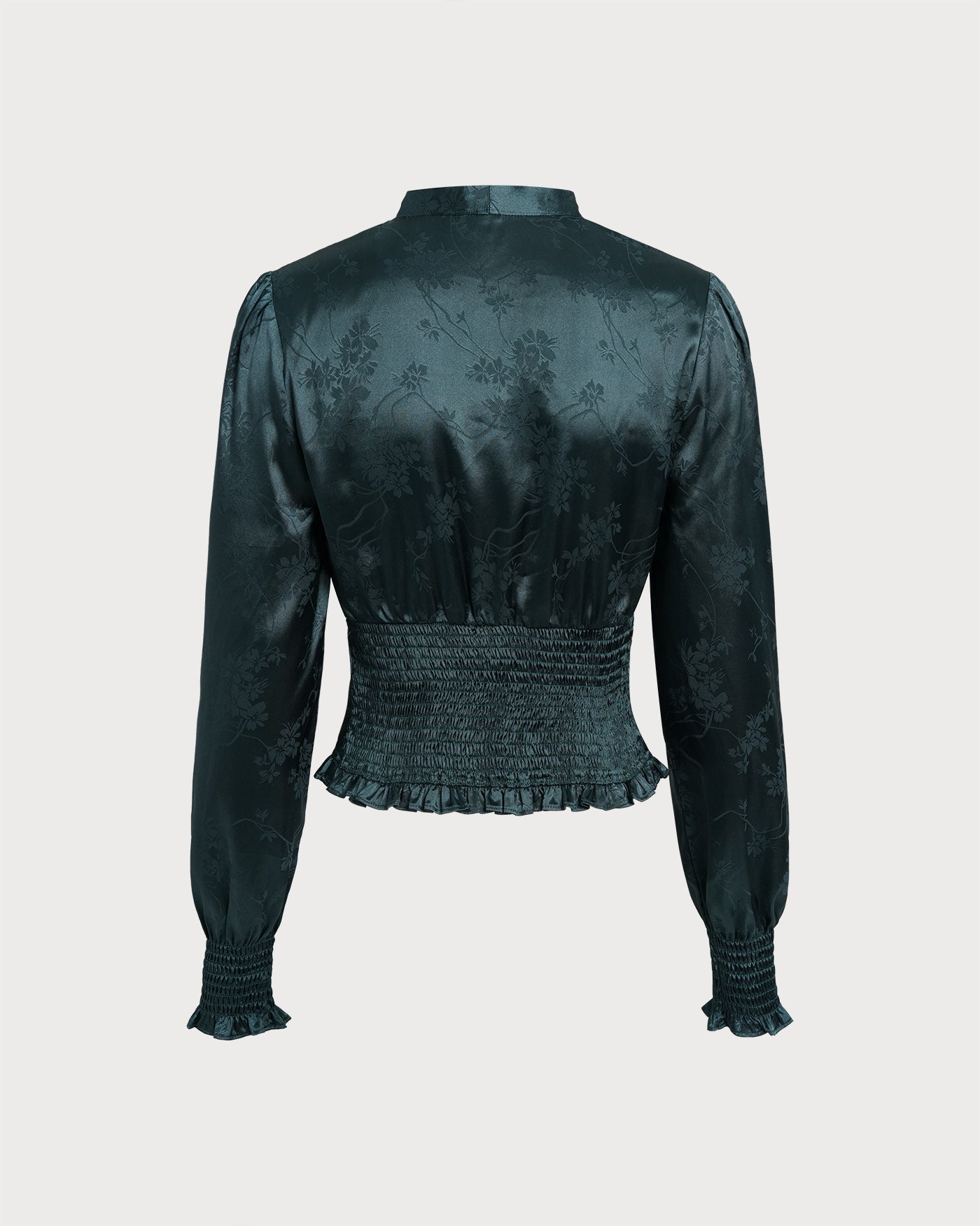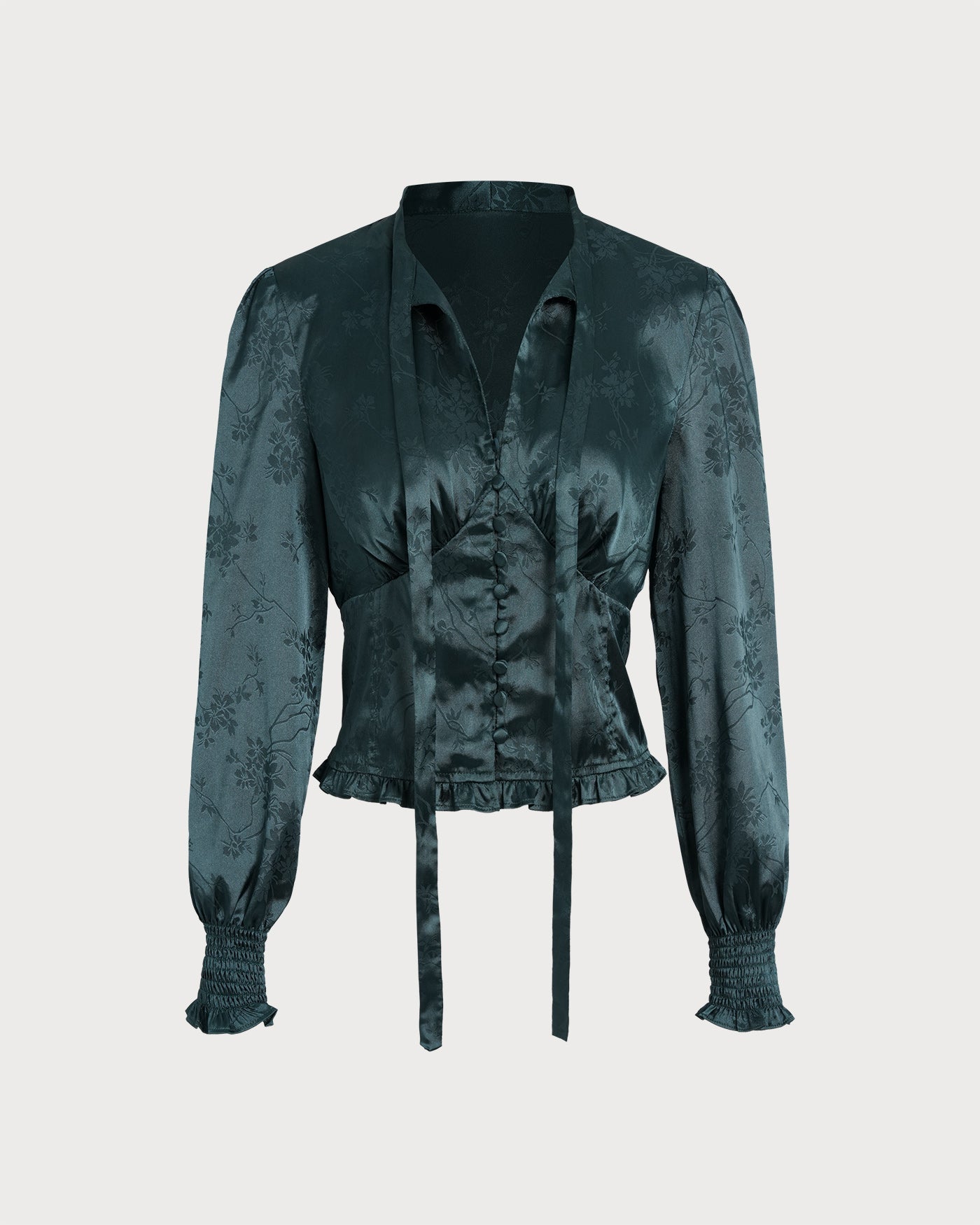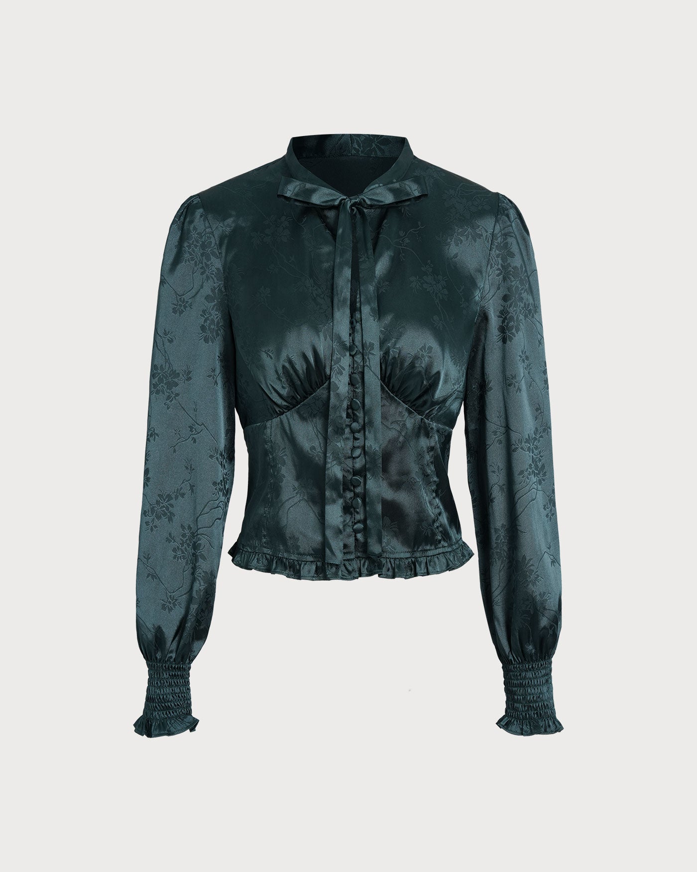 Chemisier vert jacquard à col noué, style blouse à nouer, col montant.