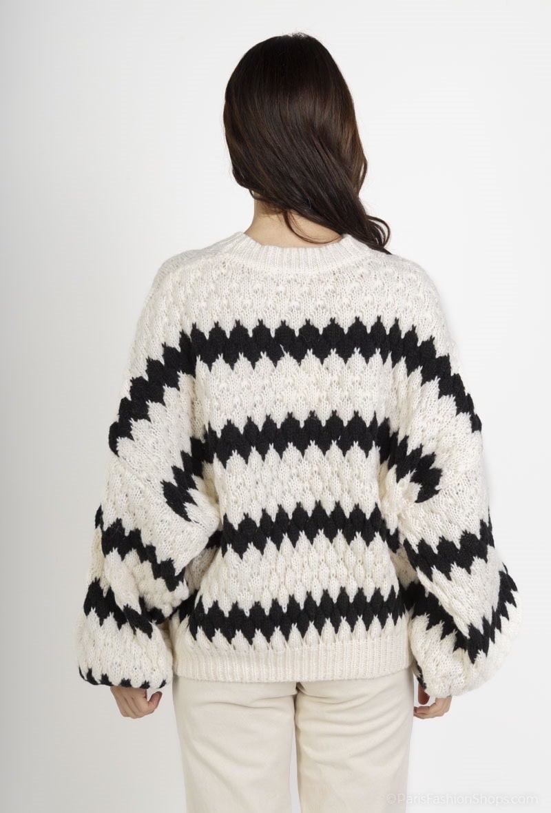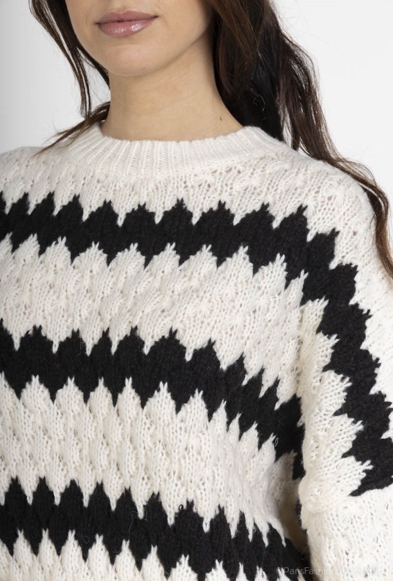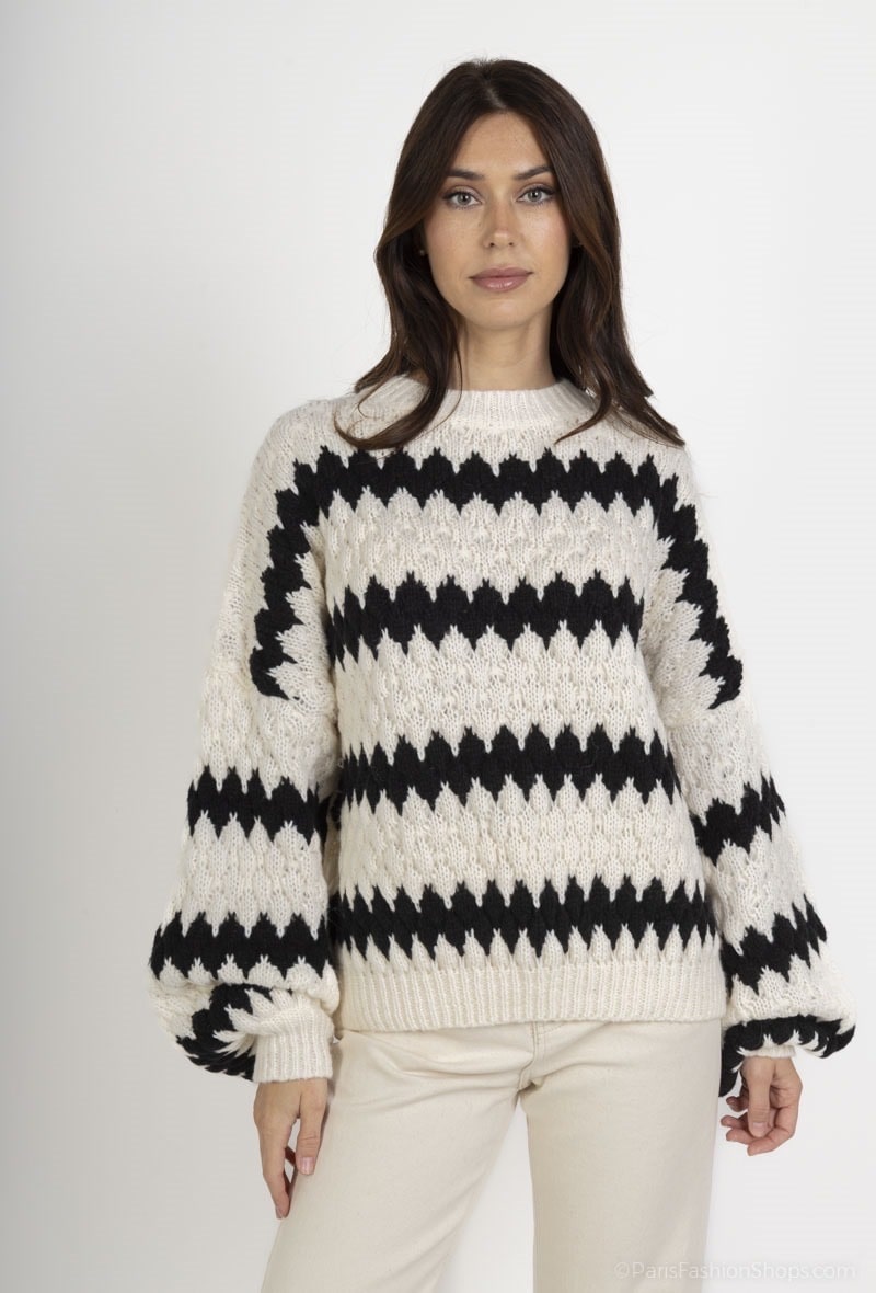 Ce pull ample et confortable possède des manches longues et volumineuses ainsi qu'une encolure ronde. Sa maille épaisse lui confère une allure chaude, idéale pour les journées fraîches. Le motif en zigzag apporte une touche à la fois ludique et élégante. Les poignets et l'ourlet côtelés créent une texture subtile et un confort optimal. Parfait avec un jean léger ou un pantalon décontracté pour un look à la fois cosy et tendance.