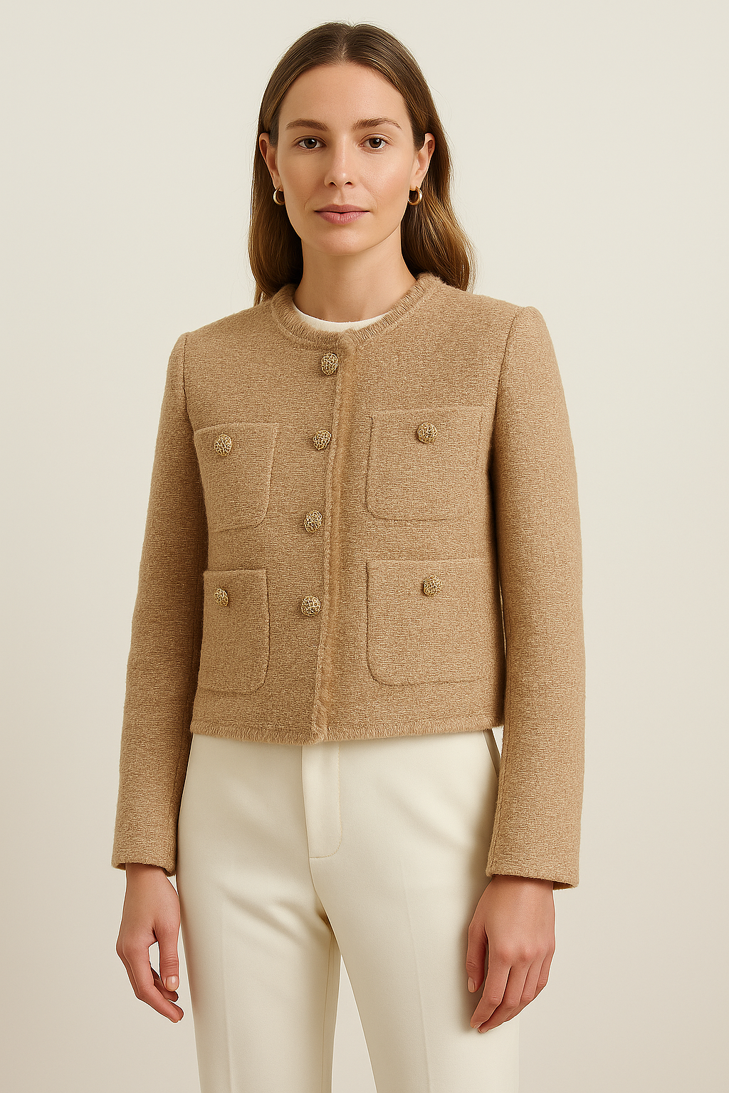 • Détails : Boutons dorés, doublure douce, texture subtile