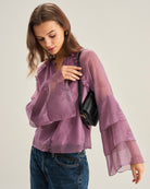 Blouse violette à fleurs en mousseline à volants et à volants, style chemisier à volants.