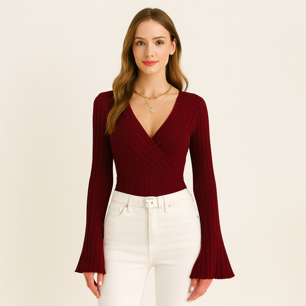 Design élégant – Coupe ajustée avec un décolleté en V flatteur et des manches trompette féminines