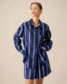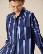 Ornée de rayures classiques bleu marine et blanches, cette chemise est confectionnée dans un tissu léger et respirant, idéal pour un confort optimal tout au long de la journée. Sa coupe décontractée et sa fermeture boutonnée la rendent polyvalente, parfaite pour le travail comme pour les sorties décontractées.